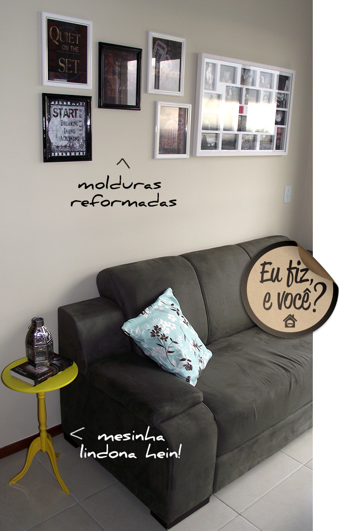 A Érica Cordeiro reformou algumas molduras e colocou gravuras vintage. Ficou muito chic com o sofá cinza e a mesinha amarela (minha combinação de cor favorita).