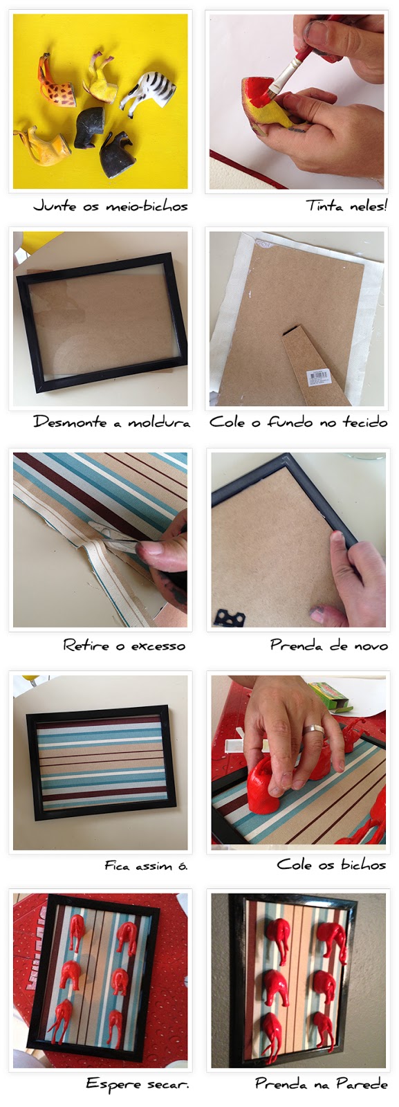 Como deu pra perceber, rolou um reaproveitamento geral nesse projeto. Ja falei da moldura aqui, o tecido é resto da reforma das cadeiras e os bichinhos, esse sapecas, tomaram um cor arregalada pra ficarem bem na pose. Tudo muito prático, fácil e rápido: